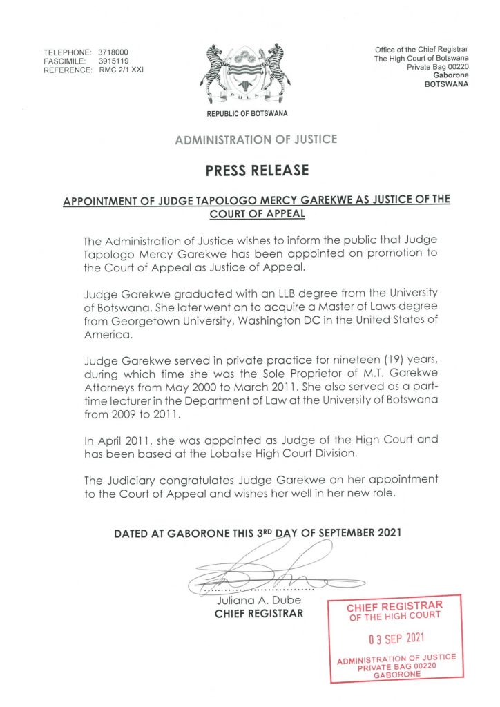 The Administration of Justice wishes to inform the public that Judge Tapologo Mercy Garekwe has been appointed on promotion to the Court of Appeal as Justice of Appeal.