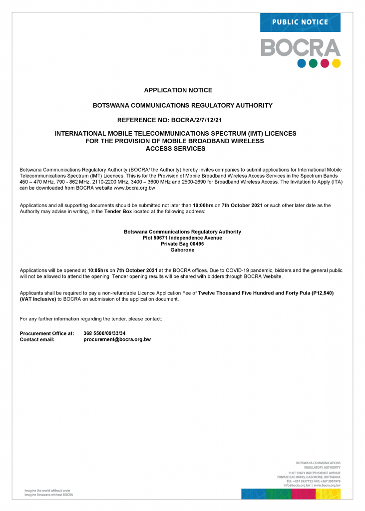 BOCRA’s tender also said that the applications will open on October 7th, 2021, at the BOCRA offices and the tender opening results will be shared with bidders through the website.