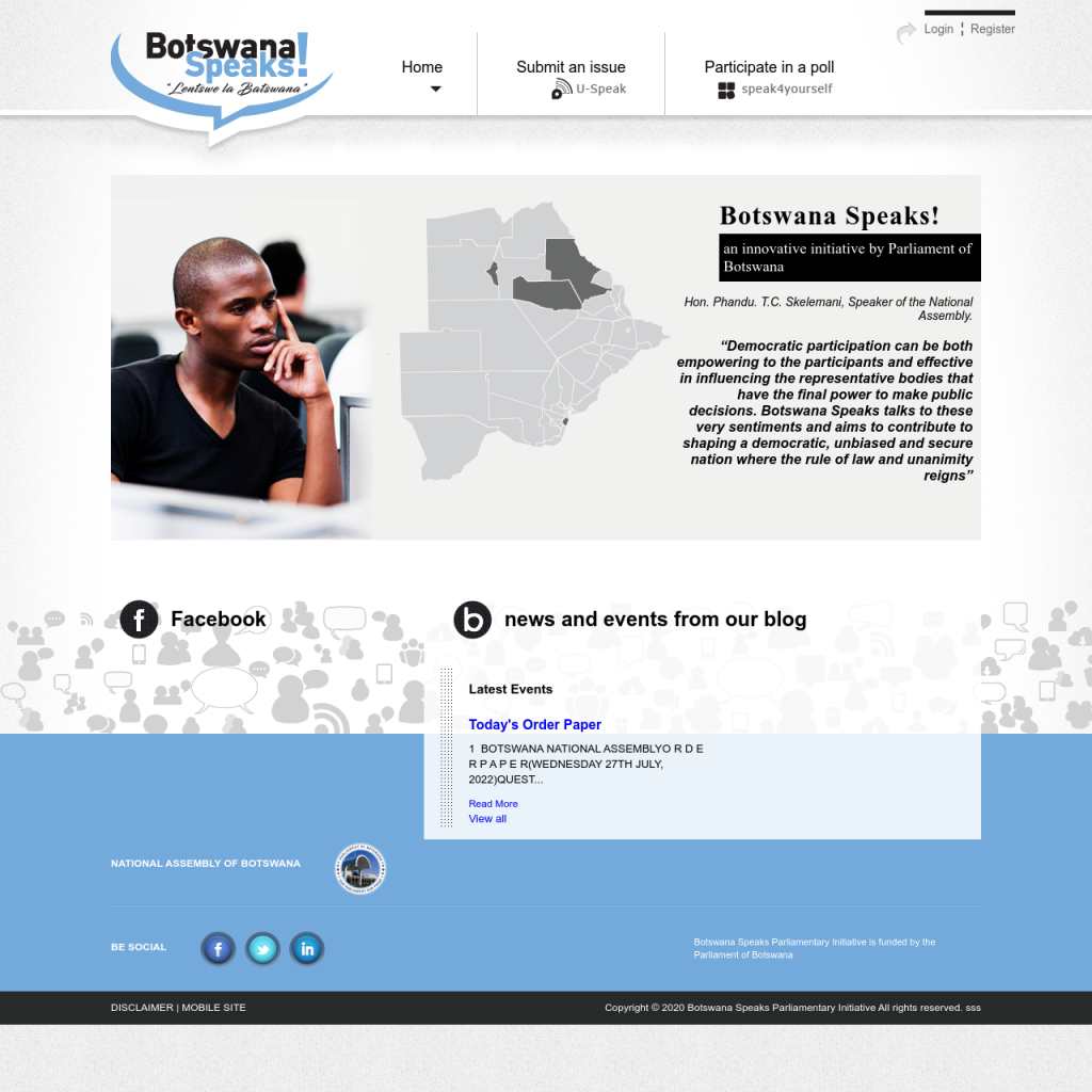 Botswana Speaks Advisor, Mr. Vasilis Koulolias, said that the platform was created in 2012 with the intention of bringing Batswana and their legislators together. He said that the initiative would enhance decision-making and share Botswana’s distinctive example of good governance with the rest of the globe.